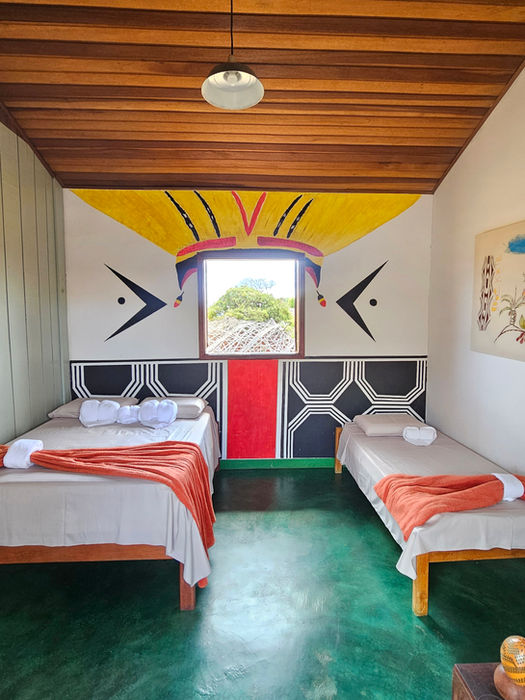 Os colchões são ótimos e garantimos roupa de cama (lençóis, travesseiros e cobertor bem quentinho) e toalha de banho. Todos os quartos são especiais, com paredes que trazem pinturas feitas por artistas do Alto Xingu.